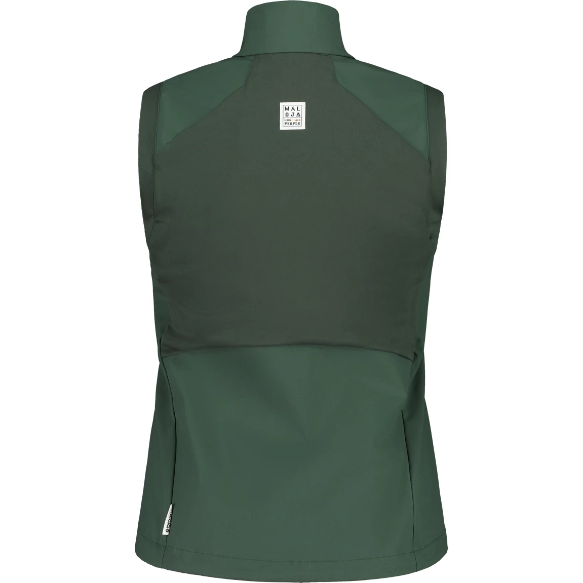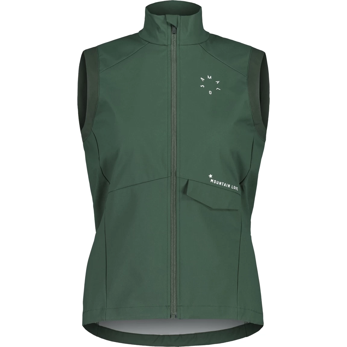 The multifunctional vest offers good wind protection through the Stormshell Light material on the front and shoulders. High collar, waistband adjustment and a flap pocket for smartphone, above Mountain Love lettering. Round Maloja lettering on the chest.