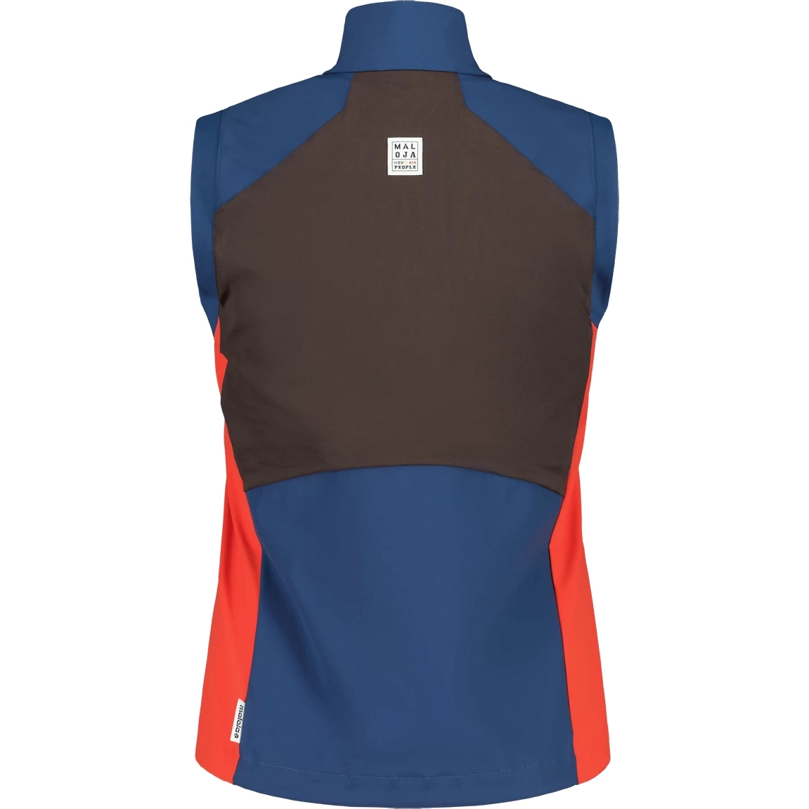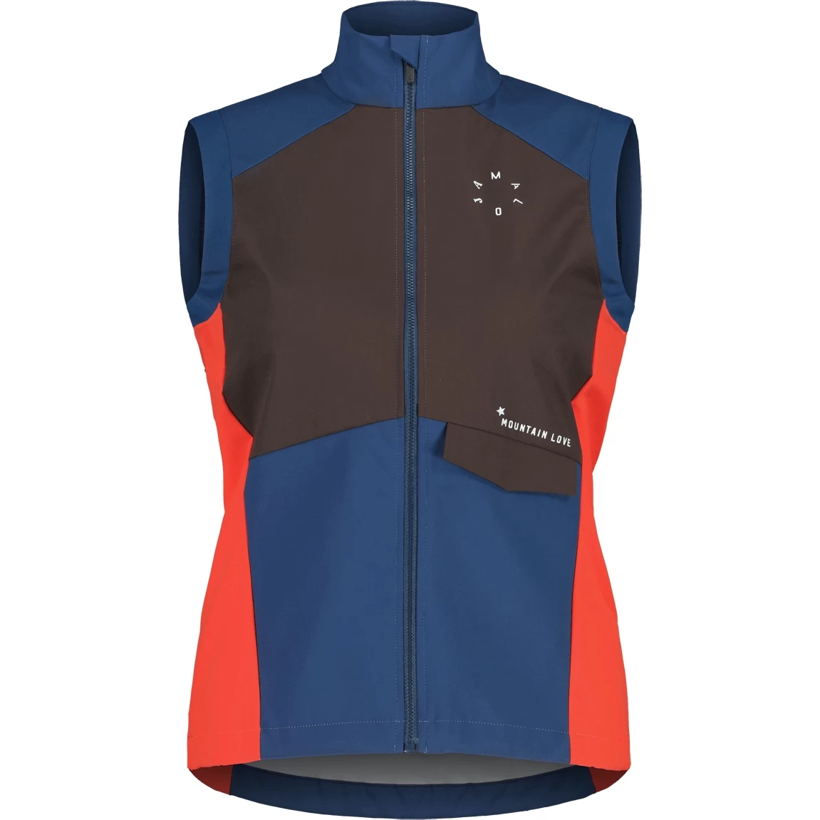 The multifunctional vest offers good wind protection through the Stormshell Light material on the front and shoulders. High collar, waistband adjustment and a flap pocket for smartphone, above Mountain Love lettering. Round Maloja lettering on the chest.