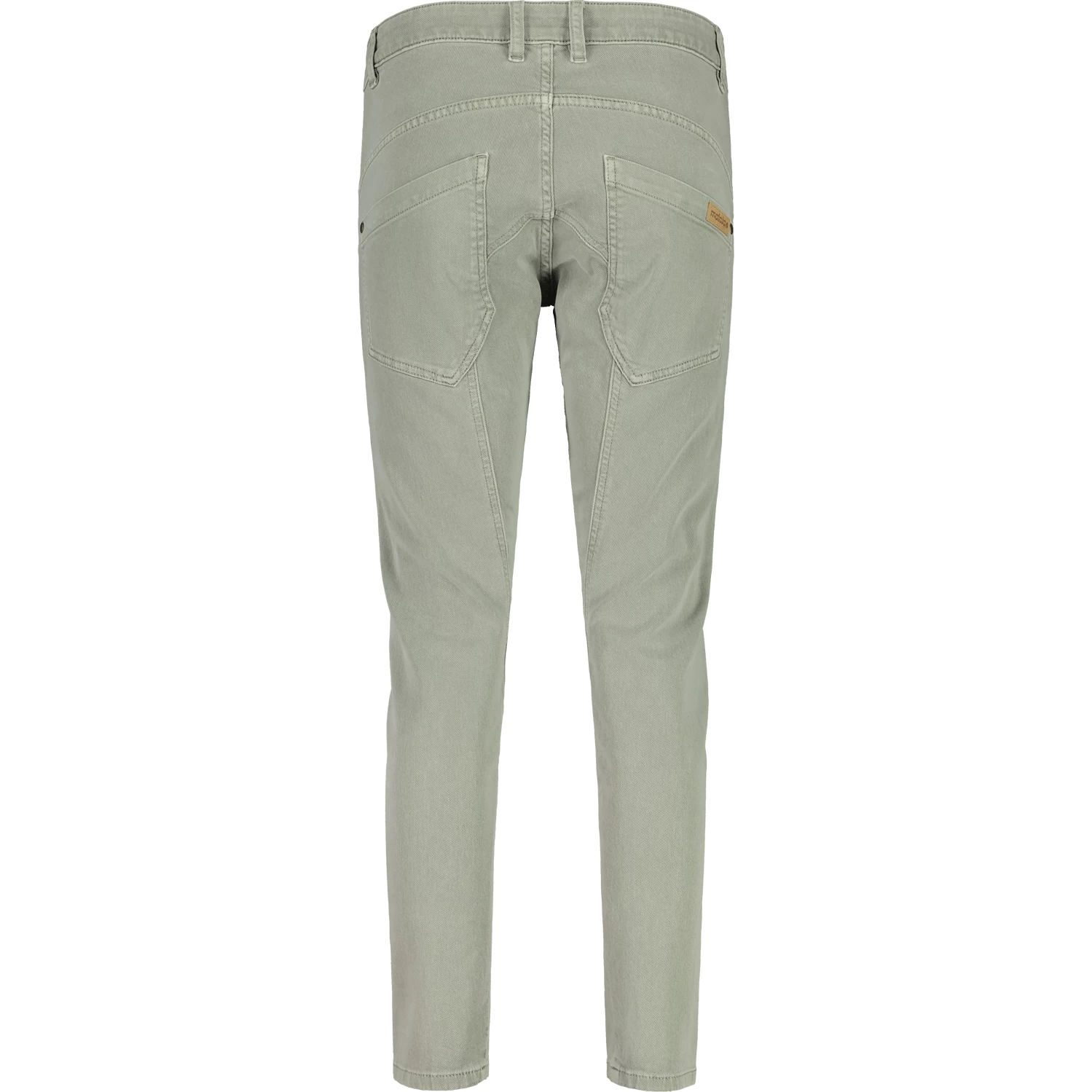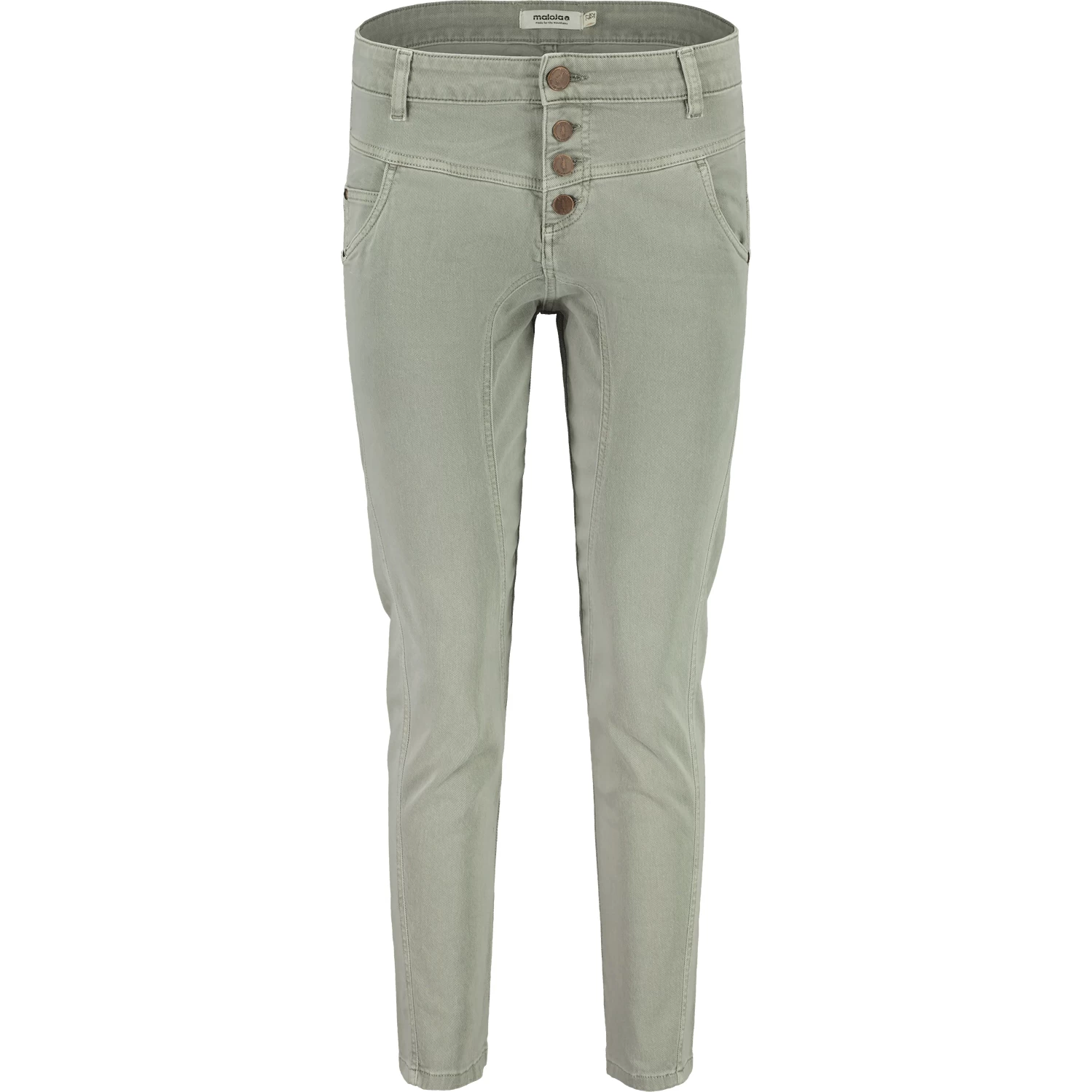Garment Dye Pants with turned side seam, two front slash pockets and one coin pocket, two back patch pockets, low waist fit and slim leg, eye-catching front button placket. Small Maloja patch on the right back pocket.