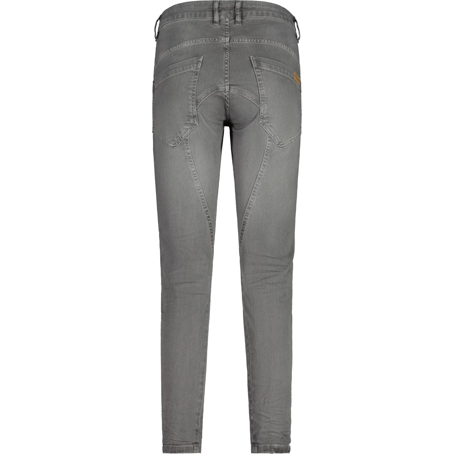 Garment dye pants with turned side seams, two front slash pockets plus a coin pocket, two back patch pockets, low waist fit and slim leg, eye-catching front button placket. Jacron Paper Maloja patch.