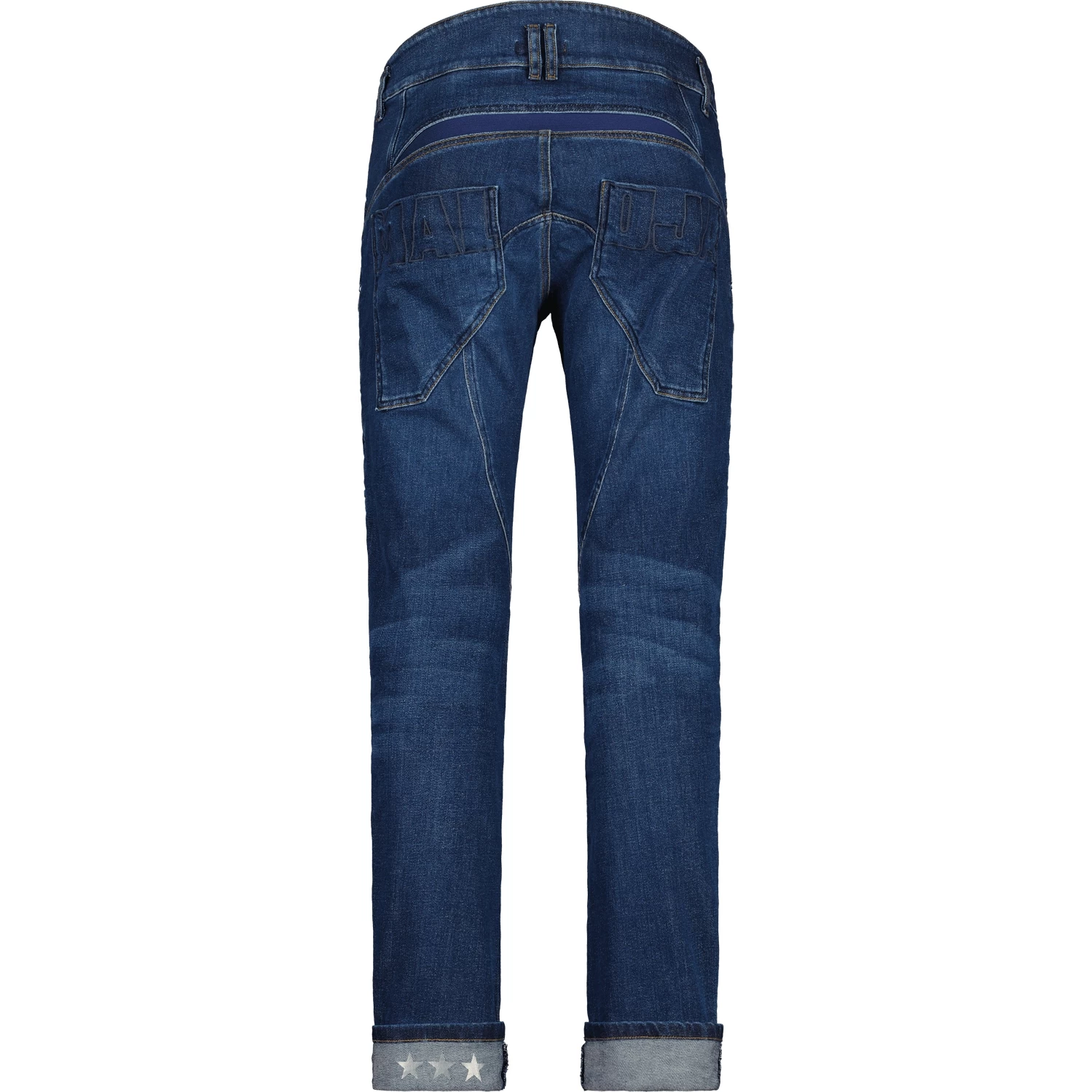 Stretch jeans with with many functional and stylish details. The jeans has a waistband with zip, button and belt loops, waistband cut high in the back with hidden stretch panel, 2 front pockets, 2 seat pockets, side ventilation zips and turned-up leg ends with transfer stars.