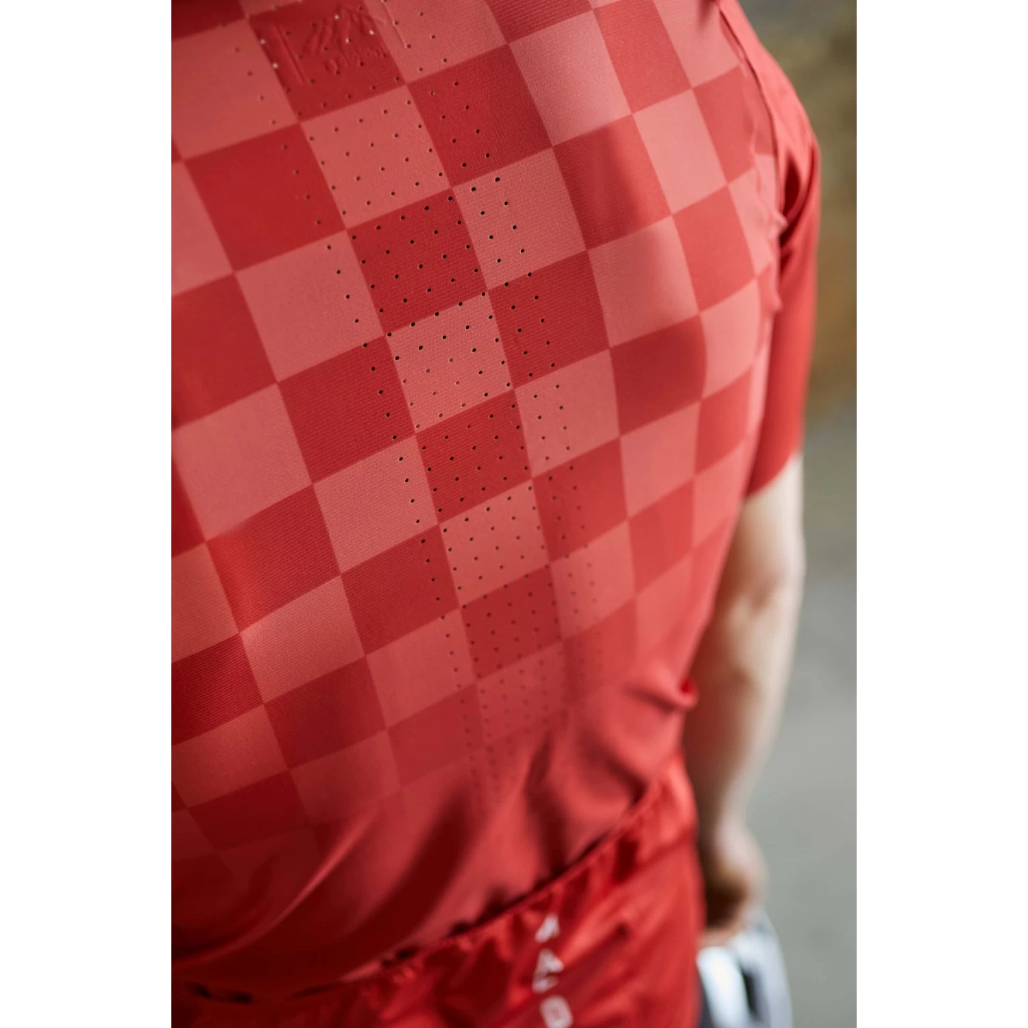 CampoM. is our most technical jersey for ambitious road cyclists. The aerodynamic Aero Stretch material is mainly bonded, the seams are taped on the inside, which ensures minimal air resistance and eliminates any friction. Extended mesh sleeves also contribute to improved aerodynamics. Laser-cut holes at the armpits and back improve ventilation. In addition to the three back pockets, an additional zippered pocket provides extra protection for cell phones and other electronic devices. With the simple, tonal Racecheck gradient, the jersey can be combined well with other garments.
