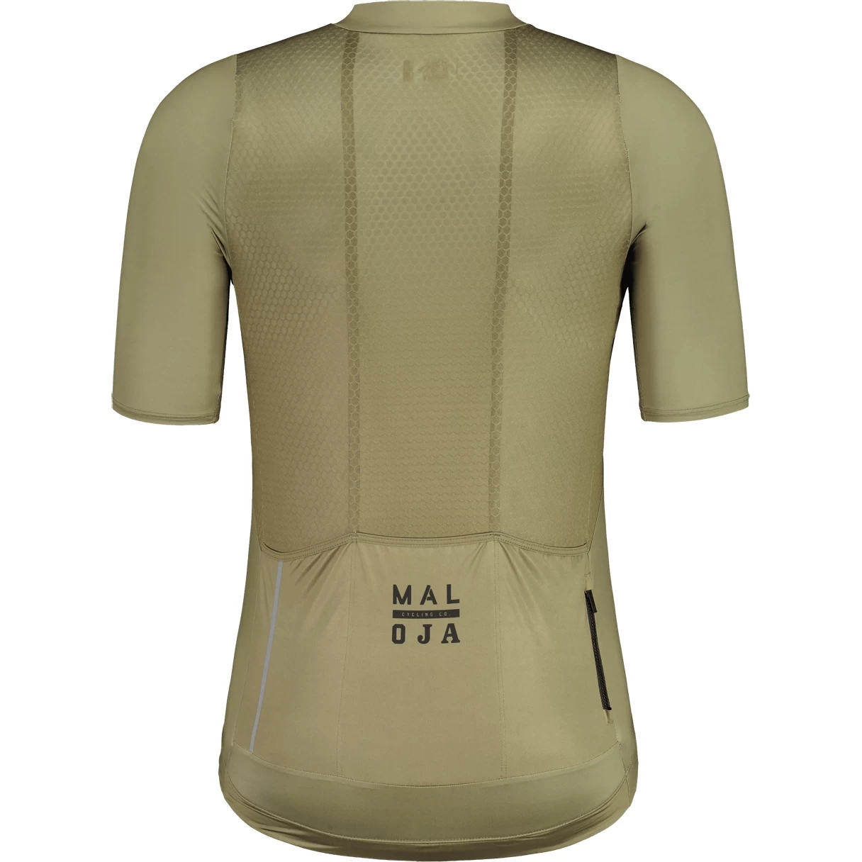 For DomM. we developed a new race cut with a shorter front, long sleeves, shortened shoulders and a tight fit. The Pushlite fabric is very soft and comfortable, at the back and the bottom of the sleeves. Honeycomb Mesh provides maximum ventilation. Three back pockets, full-length front zipper, reflective prints on the back pocket and sleeve. Split Maloja lettering on the shoulder.