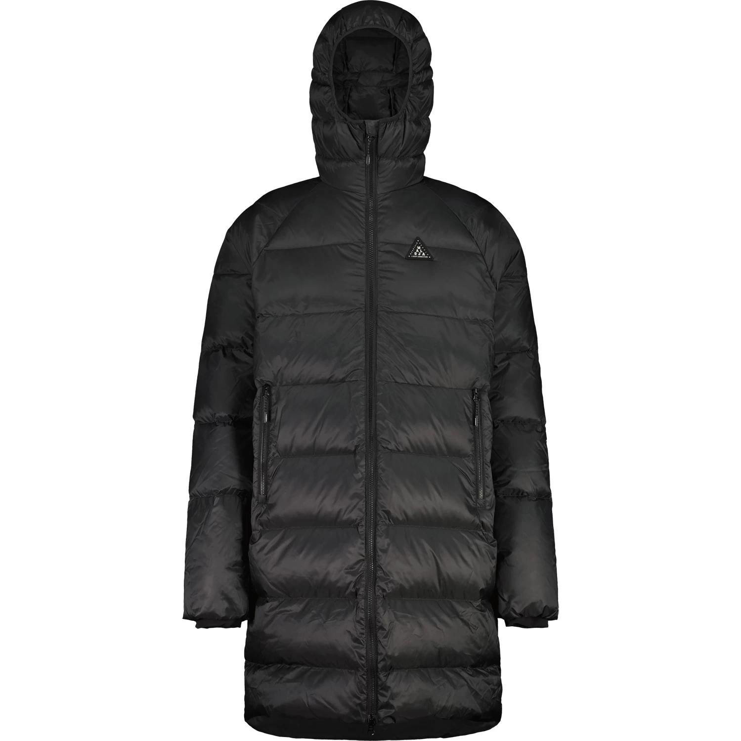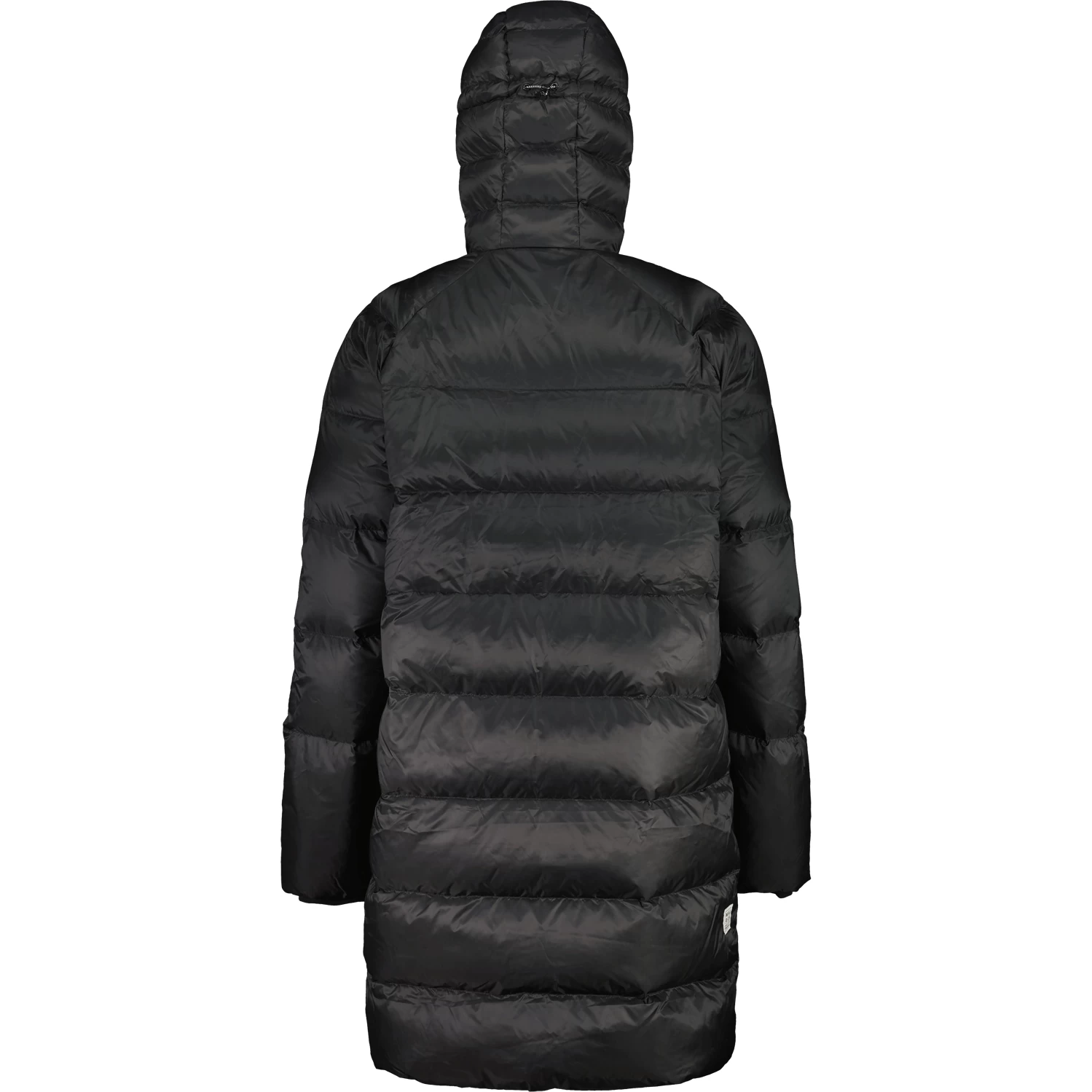 Very warm, long-cut coat with filling from recycled down. The Stormshell outer material is windproof and has a PFC-free water repellent finish. Large hood, two-way zipper, two side zipper pockets. Maloja patch on the chest.