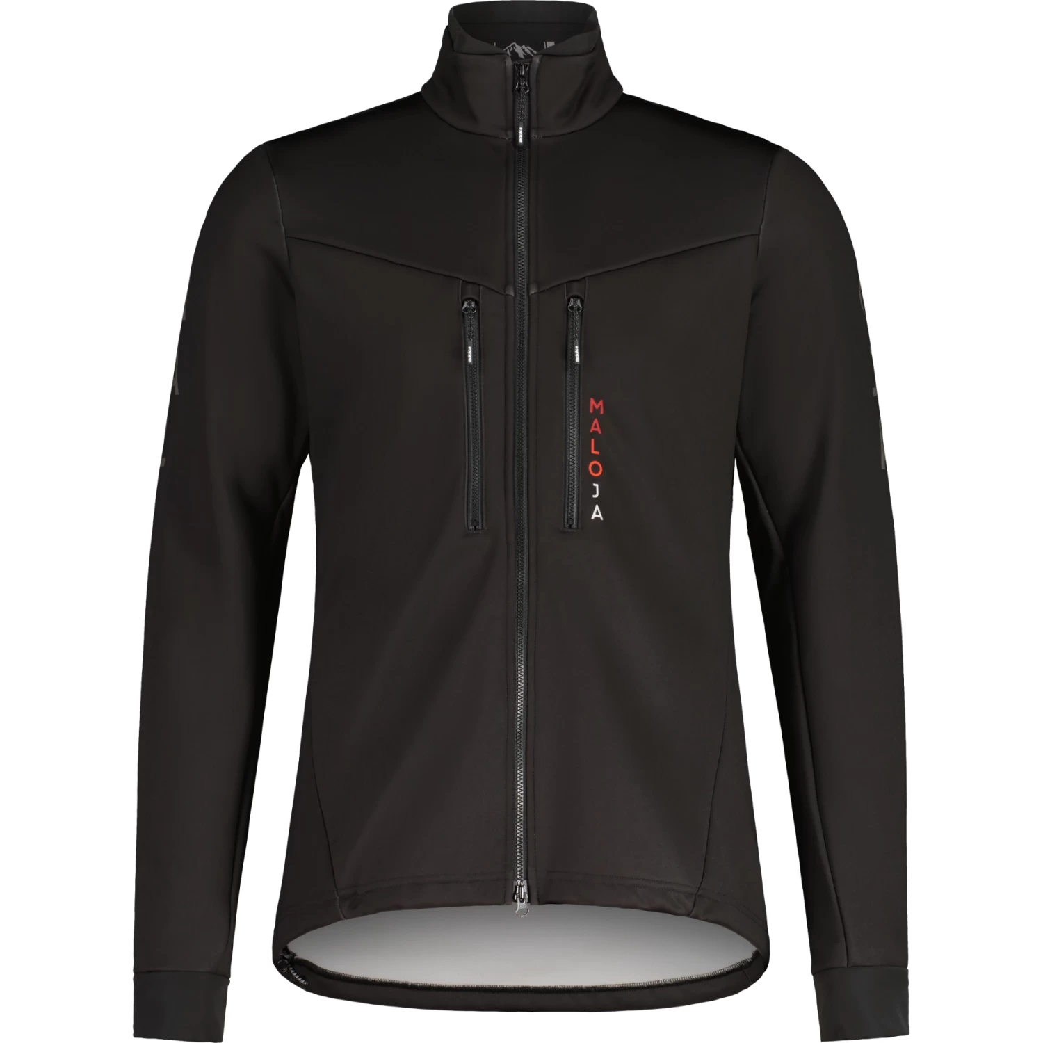 The Windblock jacket is made of quick-drying, elastic softshell material and is our warmest bike jacket in the Glide&Ride collection: it works on the bike, but also for cross-country skiing or trail running. The two-way zip allows the jacket to open from the bottom for ventilation, and it has two zippered chest pockets. Vertical Maloja lettering next to the zipper, split Maloja lettering on the upper arms.