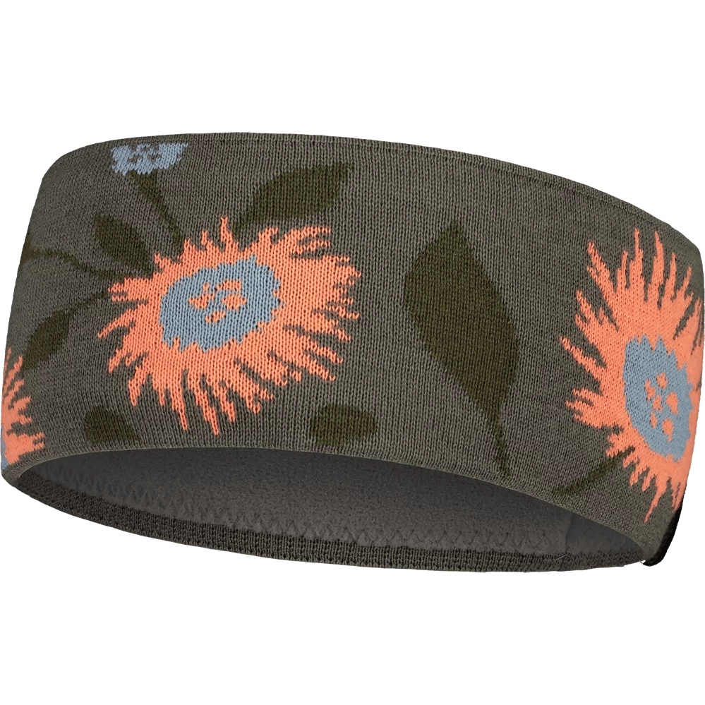 Warm wool blend headband with fleece lining inside and knit-in floral pattern. Vertical Maloja label on the edge.